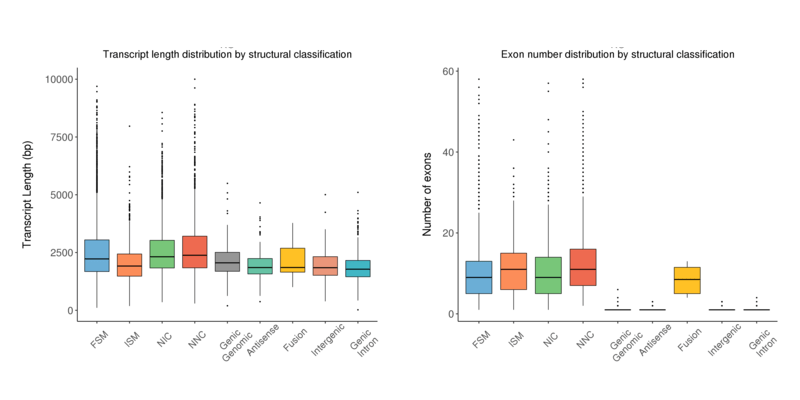 Transcript length distribution by structural classification (left) and exon numbers distribution by structural classification (right) by transcript type